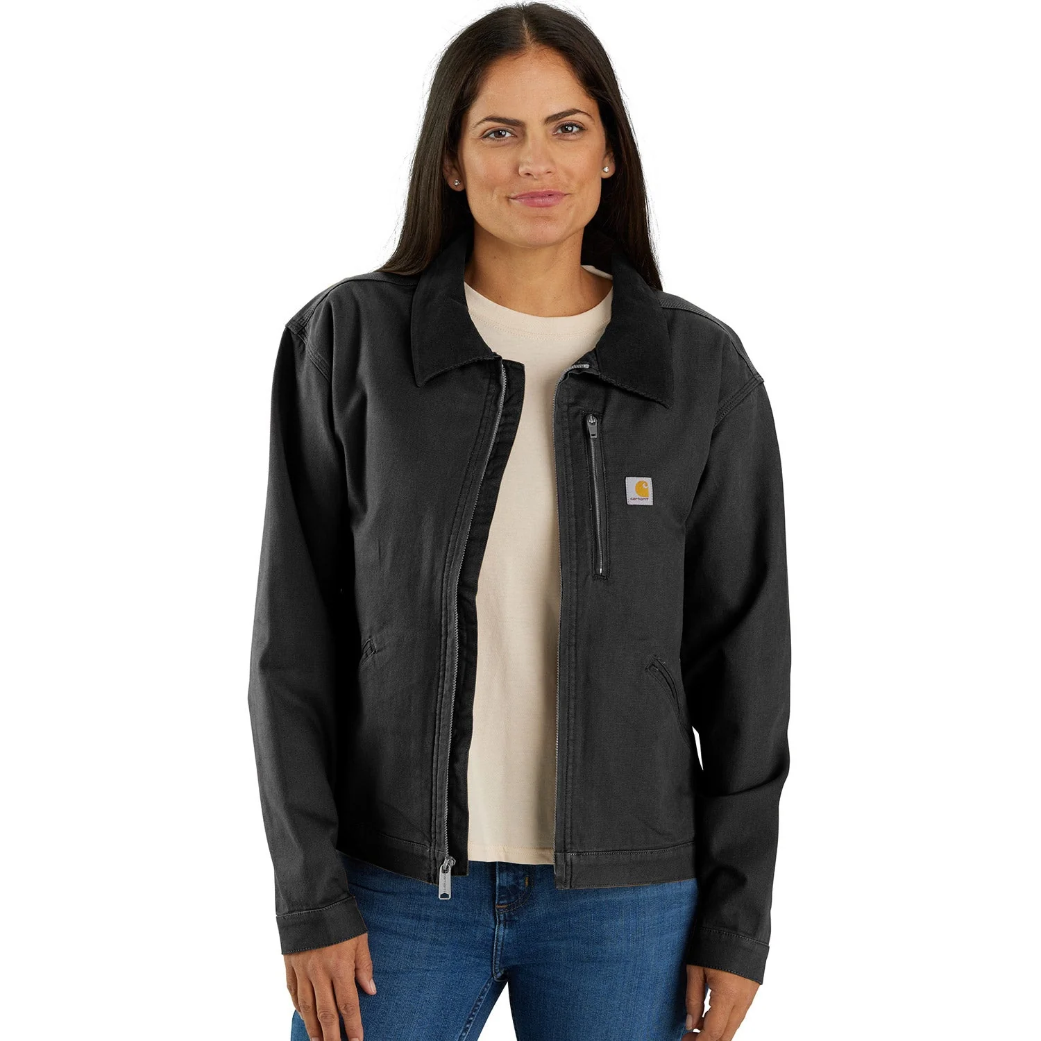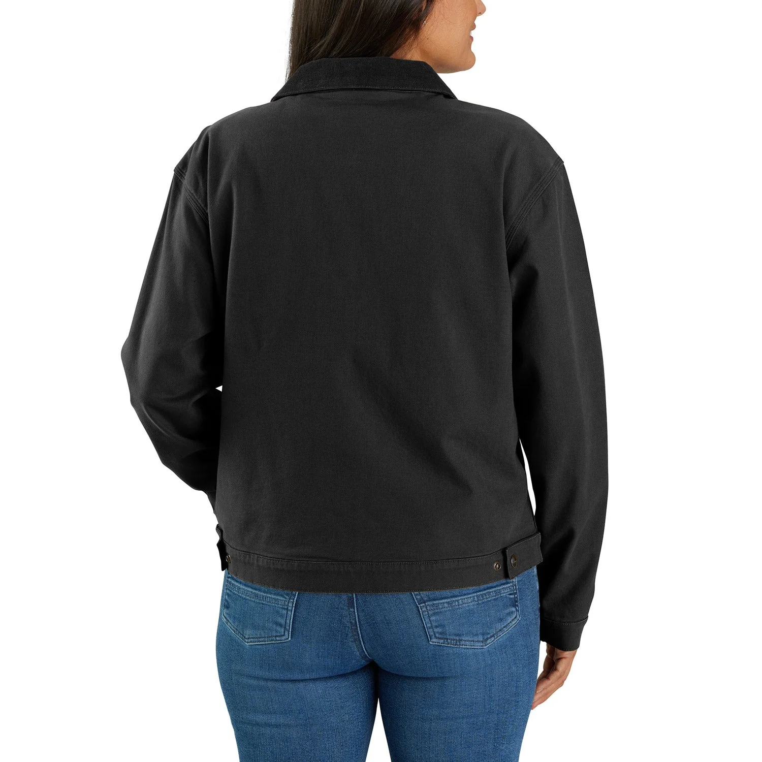 A hardworking staple for over 70 years, the legacy of the Detroit jacket is as long-lasting as its durable duck canvas. This women's Carhartt jacket updates the classic with built-in flex for easy movement. Welt pockets and interior pockets keep the tools of your trade close by, and a snap-adjustable hem lets you customize the fit. A loose fit makes layering easy.
