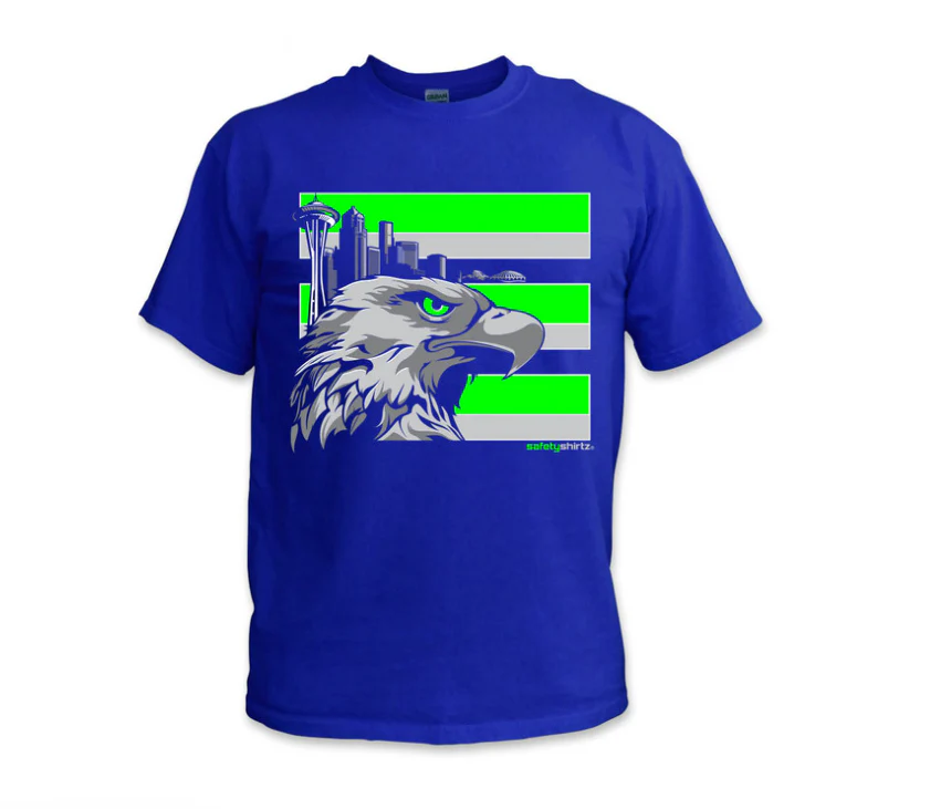 The Throwback addition with an old school twist with the stripes and bringing in our classic team colors and the good old Kingdom of course! With a strong hawk head and the nostalgic Seattle skyline as the backdrop, the Seattle SafetyShirtz t-shirt shows your dedication to your team both on the job and off.