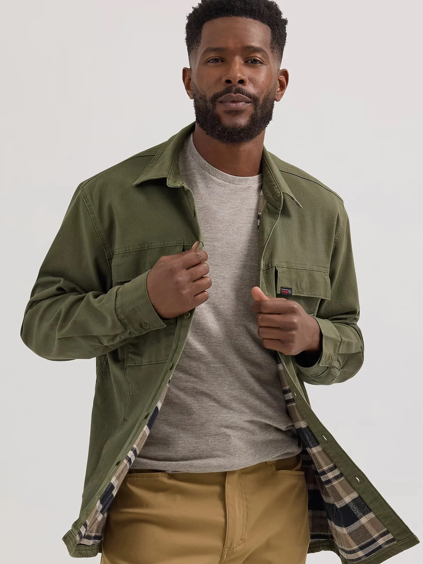 You'll be ready for anything in the ATG by Wrangler® Men's Sierra Overshirt. Its crafted from a comfortable cotton blend with just a hint of stretch, a flannel lining to keep you warm without weighing you down, and built-in UV protection from the sun. Plus, this classic collared shirt has hand pockets and flap chest pockets with bonus drop-in pockets for all your essentials. Its the ultimate outer layer for those early fall adventures.